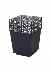 The urn is made of a high pierced part removable, with a mirror base, placed to create more depth. The bag with the ashes is inserted on the bottom part of the urn, sealable on the bottom with some screws, and then recovered by some protection stoppers to preserve the whole design.